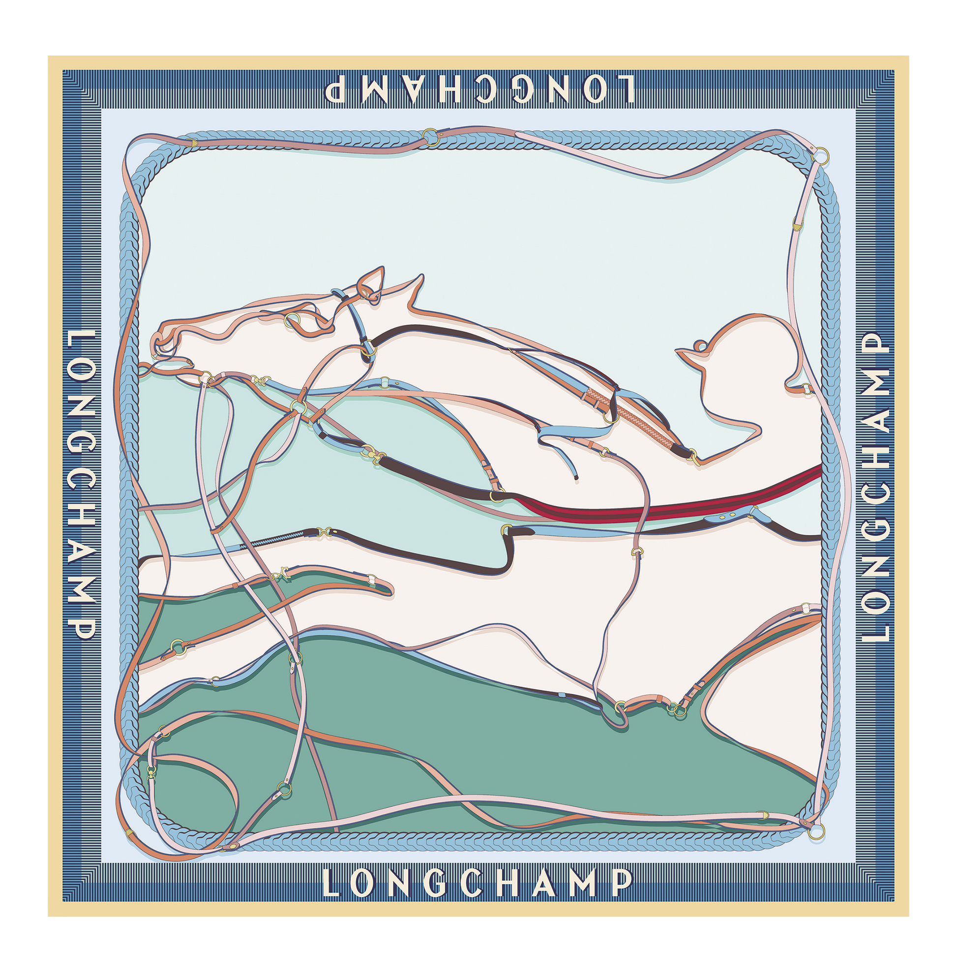 The Longchamp rider charges forward at full speed on this large silk scarf, driven by a conquering momentum. The loose straps hold the horse, propelling it toward its goal.